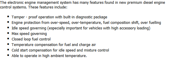 - Can operate in dual fuel mode with same power and torque charastistics displayed by the diesel-powered engine.